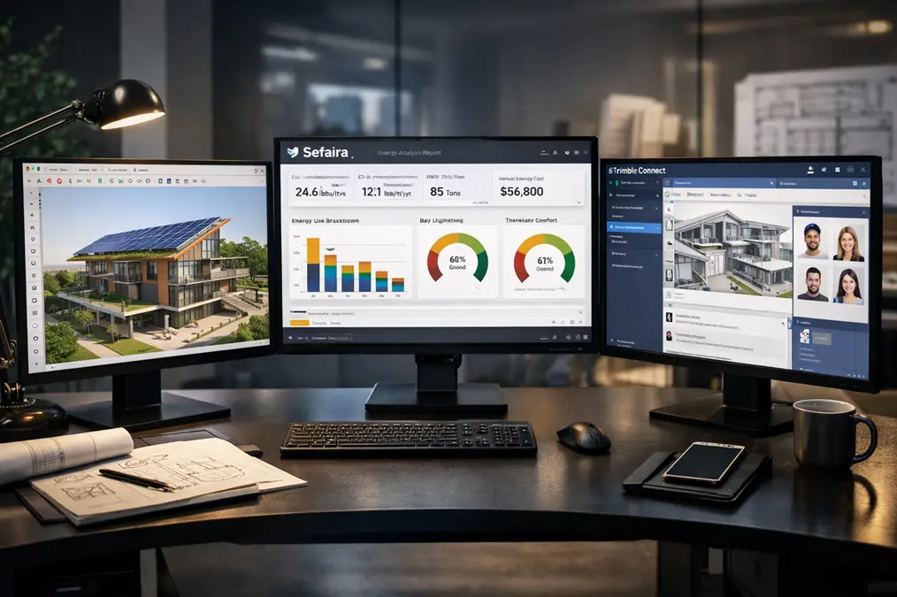 2. Integração Técnica (BIM + IA): O Arquiteto Híbrido utiliza o SketchUp não apenas para modelar, mas como um hub. Ele integra o modelo 3D com análise energética (Sefaira), colaboração em nuvem (Trimble Connect) e renderização em tempo real.
