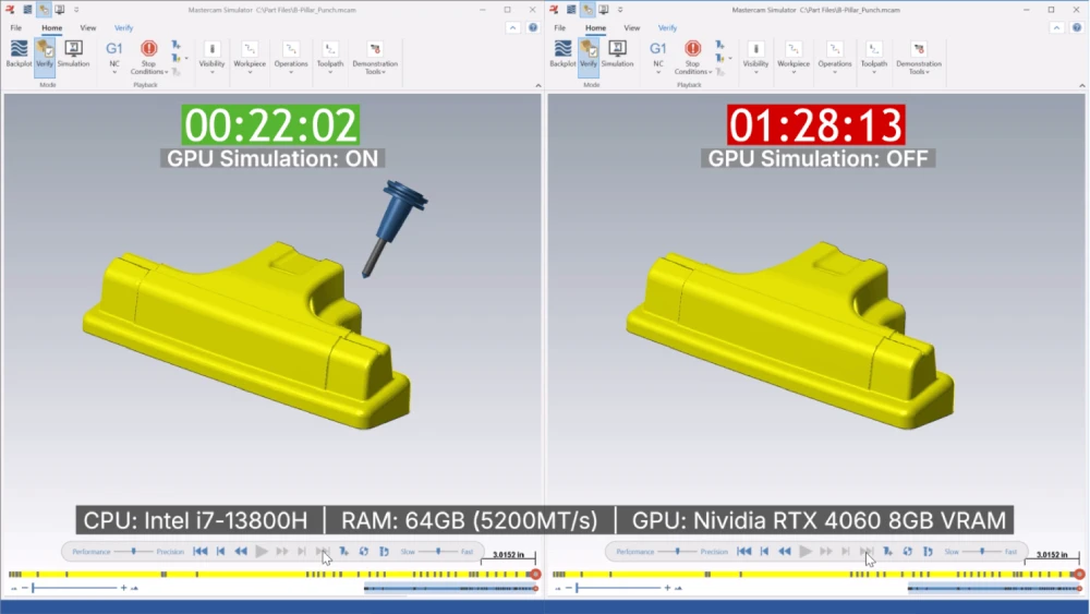 Um exemplo do próprio material da Mastercam: um componente multieixos típico de aeroespacial que antes levava 3–4 horas para simular em CPU passa a ser verificado em cerca de 15–20 minutos com GPU adequada.